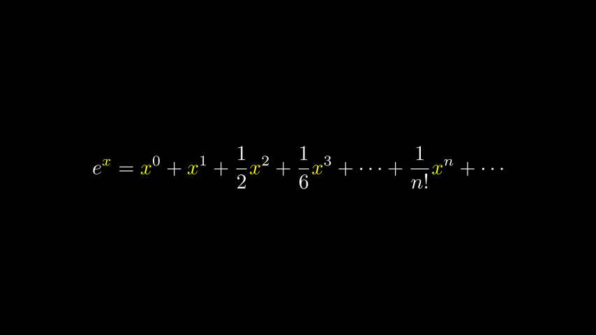 r"e^x = x^0 + x^1 + \frac{1}{2} x^2 + \frac{1}{6} x^3 + \cdots + \frac{1}{n!} x^n + \cdots",
