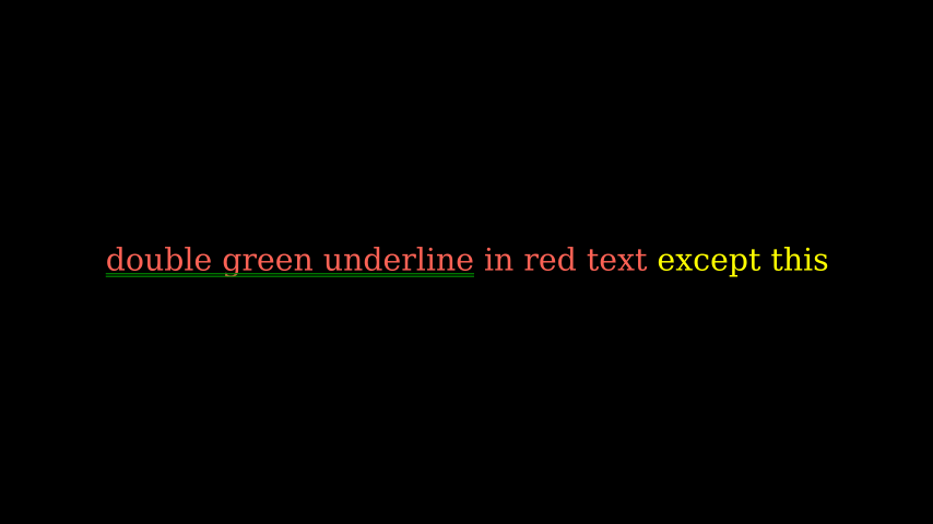 f'<span underline="double" underline_color="green">double green underline</span> in red text<span fgcolor="{YELLOW}"> except this</span>',